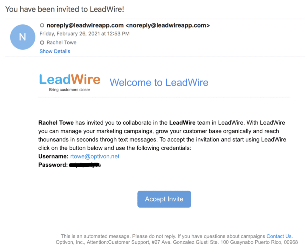 When you sign up for an account with LeadWire or another user creates a user account for you, you will receive an invitation email like the one below.